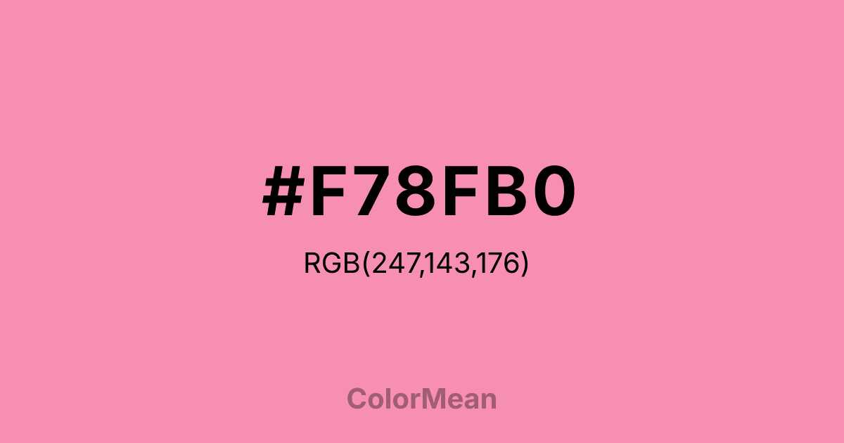 #F78FB0 RGB value is (247, 143, 176). The hex color red value is 247, green is 143, and blue is 176. Its HSL format shows a hue of 341°, saturation of 87 percent, and lightness of 76 percent. The CMYK process values are 0 percent, 42 percent, 29 percent, 3 percent.