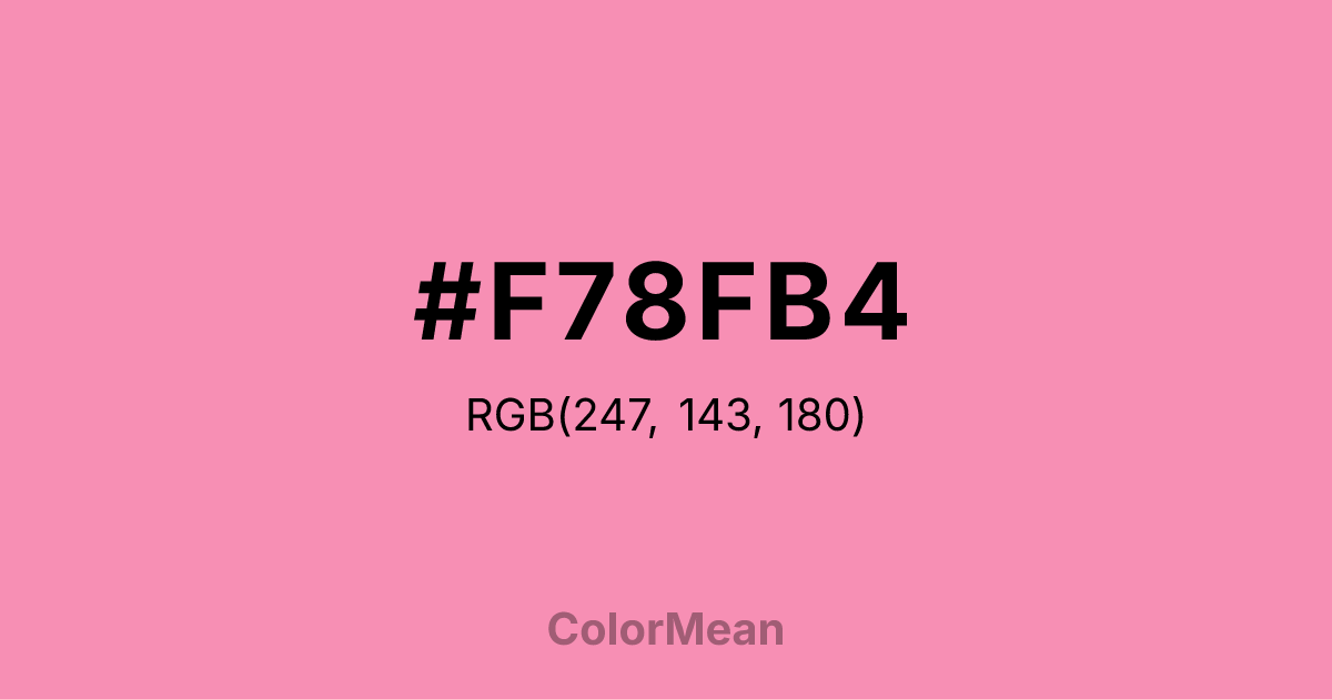 #F78FB4 RGB value is (247, 143, 180). The hex color red value is 247, green is 143, and blue is 180. Its HSL format shows a hue of 339°, saturation of 87 percent, and lightness of 76 percent. The CMYK process values are 0 percent, 42 percent, 27 percent, 3 percent.