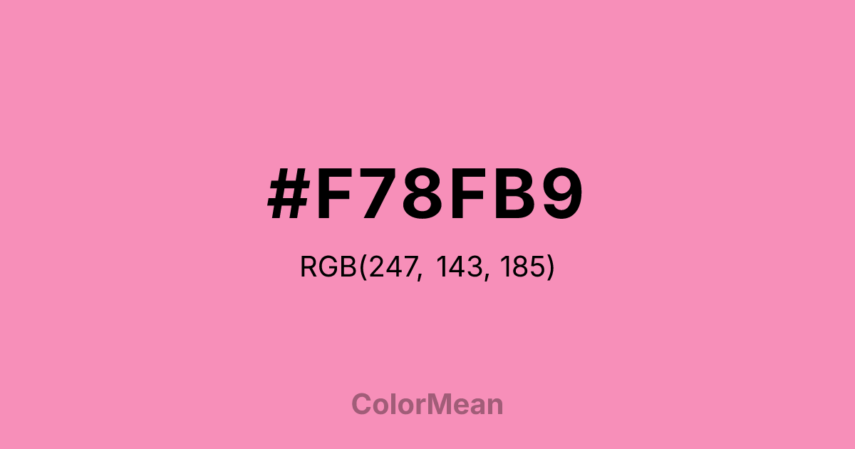 #F78FB9 RGB value is (247, 143, 185). The hex color red value is 247, green is 143, and blue is 185. Its HSL format shows a hue of 336°, saturation of 87 percent, and lightness of 76 percent. The CMYK process values are 0 percent, 42 percent, 25 percent, 3 percent.