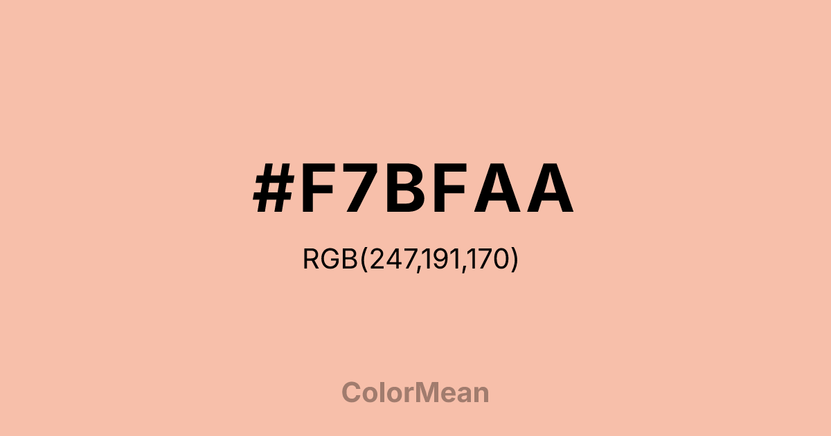 #F7BFAA RGB value is (247, 191, 170). The hex color red value is 247, green is 191, and blue is 170. Its HSL format shows a hue of 16°, saturation of 83 percent, and lightness of 82 percent. The CMYK process values are 0 percent, 23 percent, 31 percent, 3 percent.