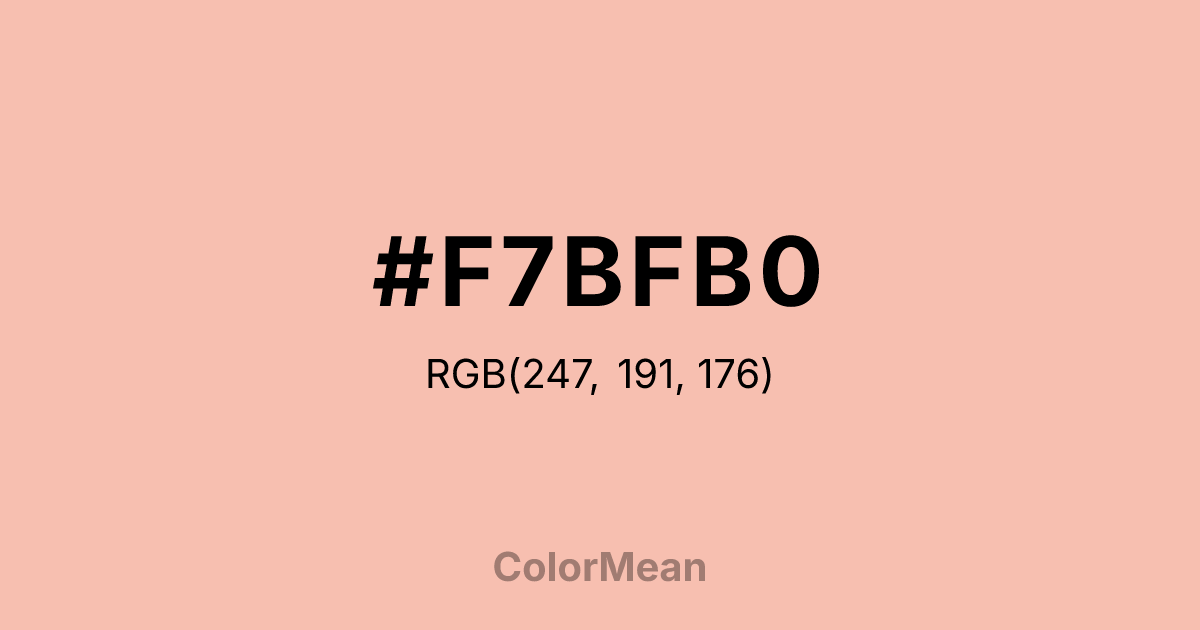#F7BFB0 RGB value is (247, 191, 176). The hex color red value is 247, green is 191, and blue is 176. Its HSL format shows a hue of 13°, saturation of 82 percent, and lightness of 83 percent. The CMYK process values are 0 percent, 23 percent, 29 percent, 3 percent.