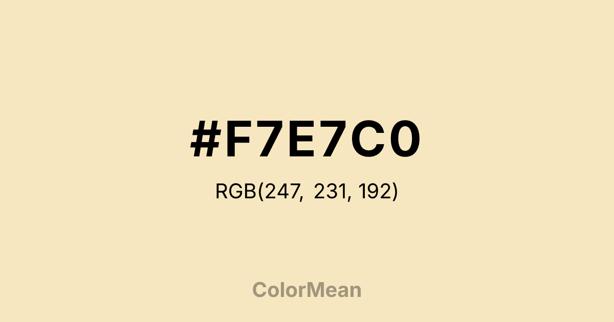 #F7E7C0 RGB value is (247, 231, 192). The hex color red value is 247, green is 231, and blue is 192. Its HSL format shows a hue of 43°, saturation of 77 percent, and lightness of 86 percent. The CMYK process values are 0 percent, 6 percent, 22 percent, 3 percent.