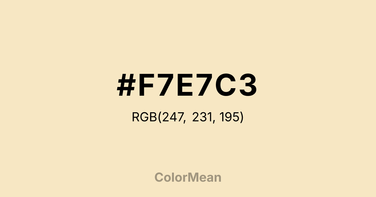 #F7E7C3 RGB value is (247, 231, 195). The hex color red value is 247, green is 231, and blue is 195. Its HSL format shows a hue of 42°, saturation of 76 percent, and lightness of 87 percent. The CMYK process values are 0 percent, 6 percent, 21 percent, 3 percent.