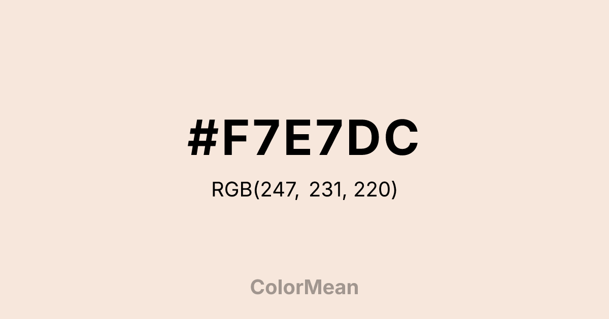 #F7E7DC RGB value is (247, 231, 220). The hex color red value is 247, green is 231, and blue is 220. Its HSL format shows a hue of 24°, saturation of 63 percent, and lightness of 92 percent. The CMYK process values are 0 percent, 6 percent, 11 percent, 3 percent.