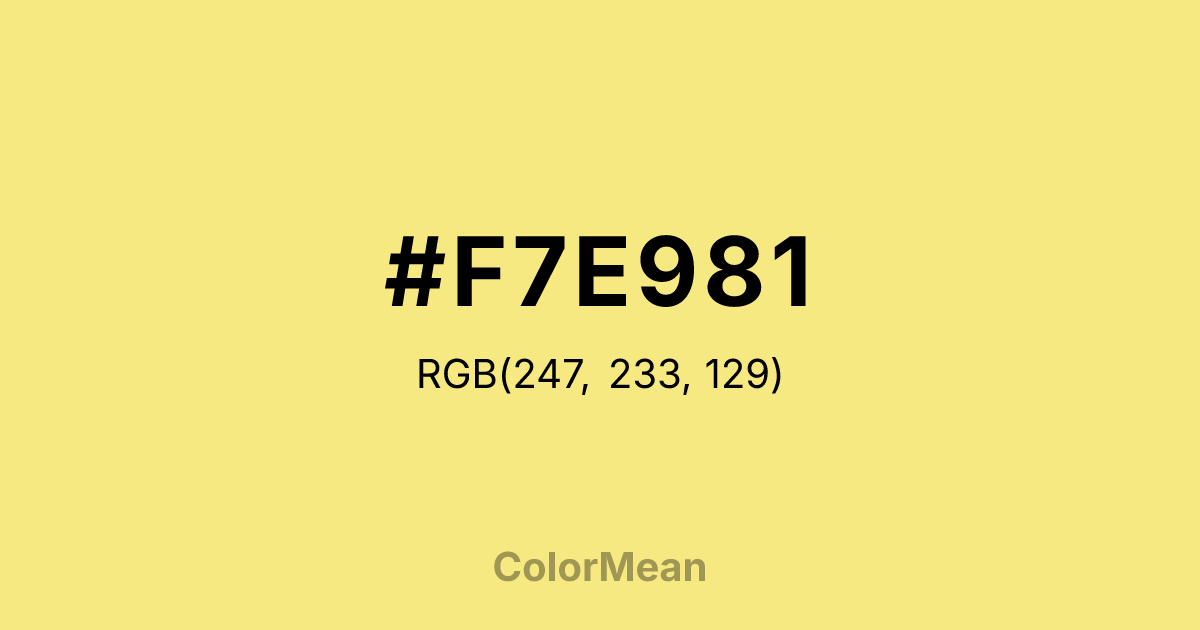 #F7E981 RGB value is (247, 233, 129). The hex color red value is 247, green is 233, and blue is 129. Its HSL format shows a hue of 53°, saturation of 88 percent, and lightness of 74 percent. The CMYK process values are 0 percent, 6 percent, 48 percent, 3 percent.