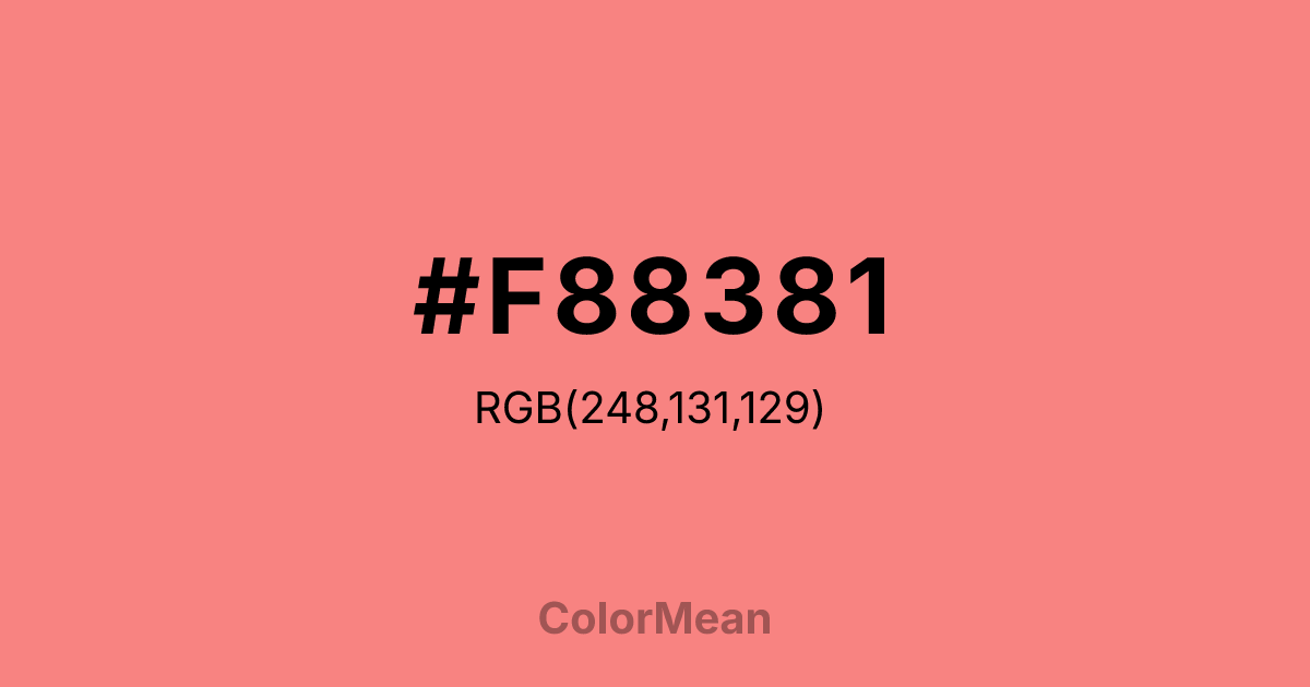 #F88381 RGB value is (248, 131, 129). The hex color red value is 248, green is 131, and blue is 129. Its HSL format shows a hue of 1°, saturation of 89 percent, and lightness of 74 percent. The CMYK process values are 0 percent, 47 percent, 48 percent, 3 percent.