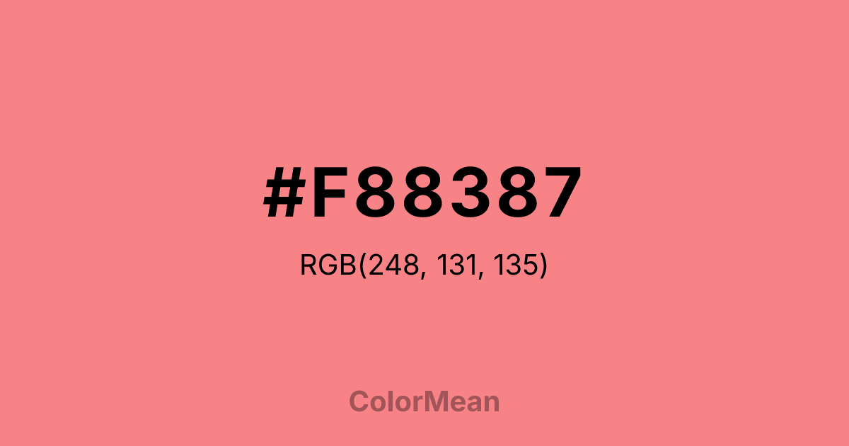#F88387 RGB value is (248, 131, 135). The hex color red value is 248, green is 131, and blue is 135. Its HSL format shows a hue of 358°, saturation of 89 percent, and lightness of 74 percent. The CMYK process values are 0 percent, 47 percent, 46 percent, 3 percent.