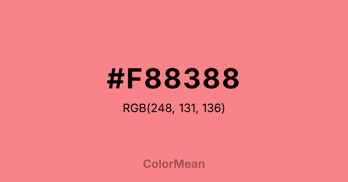 #F88388 RGB value is (248, 131, 136). The hex color red value is 248, green is 131, and blue is 136. Its HSL format shows a hue of 357°, saturation of 89 percent, and lightness of 74 percent. The CMYK process values are 0 percent, 47 percent, 45 percent, 3 percent.