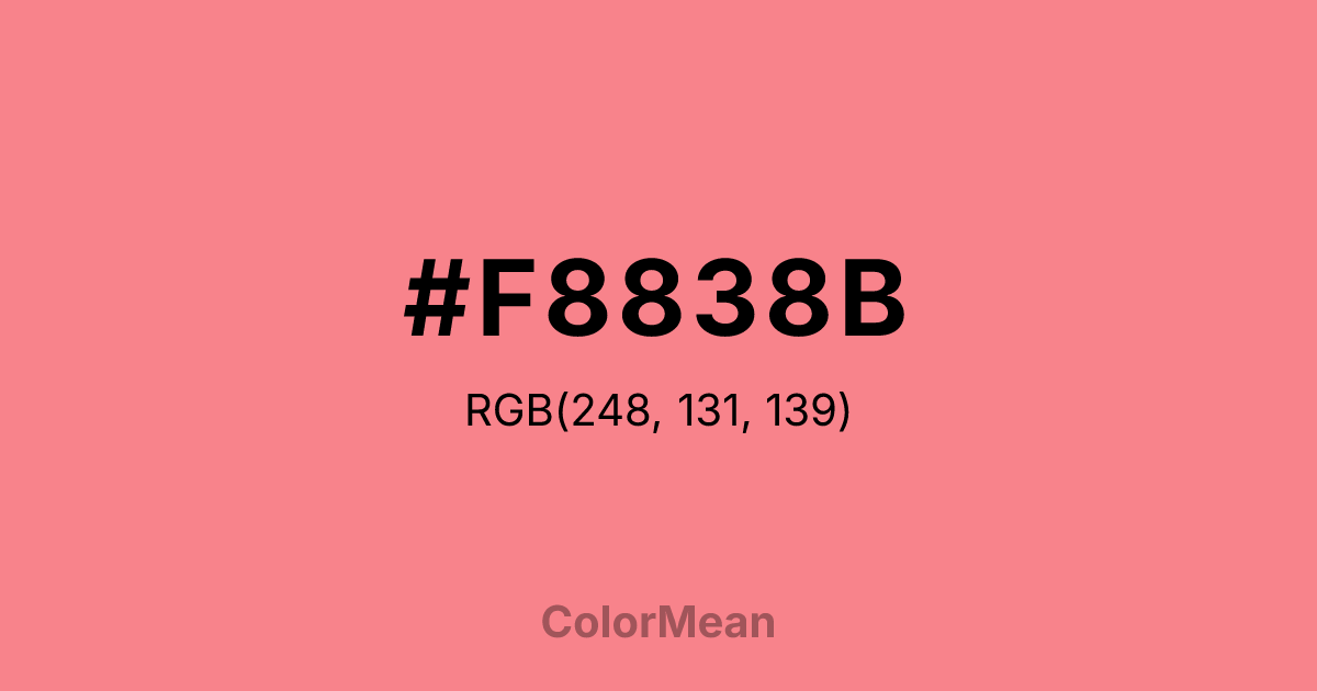 #F8838B RGB value is (248, 131, 139). The hex color red value is 248, green is 131, and blue is 139. Its HSL format shows a hue of 356°, saturation of 89 percent, and lightness of 74 percent. The CMYK process values are 0 percent, 47 percent, 44 percent, 3 percent.