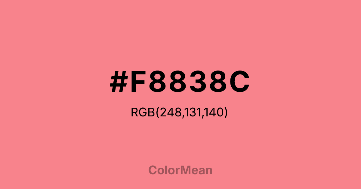 #F8838C RGB value is (248, 131, 140). The hex color red value is 248, green is 131, and blue is 140. Its HSL format shows a hue of 355°, saturation of 89 percent, and lightness of 74 percent. The CMYK process values are 0 percent, 47 percent, 44 percent, 3 percent.