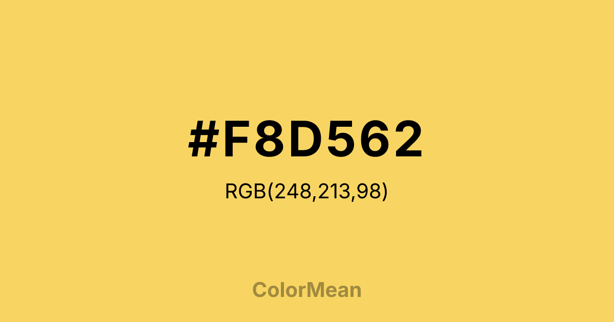 #F8D562 RGB value is (248, 213, 98). The hex color red value is 248, green is 213, and blue is 98. Its HSL format shows a hue of 46°, saturation of 91 percent, and lightness of 68 percent. The CMYK process values are 0 percent, 14 percent, 60 percent, 3 percent.