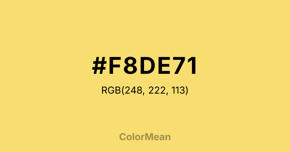 #F8DE71 RGB value is (248, 222, 113). The hex color red value is 248, green is 222, and blue is 113. Its HSL format shows a hue of 48°, saturation of 91 percent, and lightness of 71 percent. The CMYK process values are 0 percent, 10 percent, 54 percent, 3 percent.