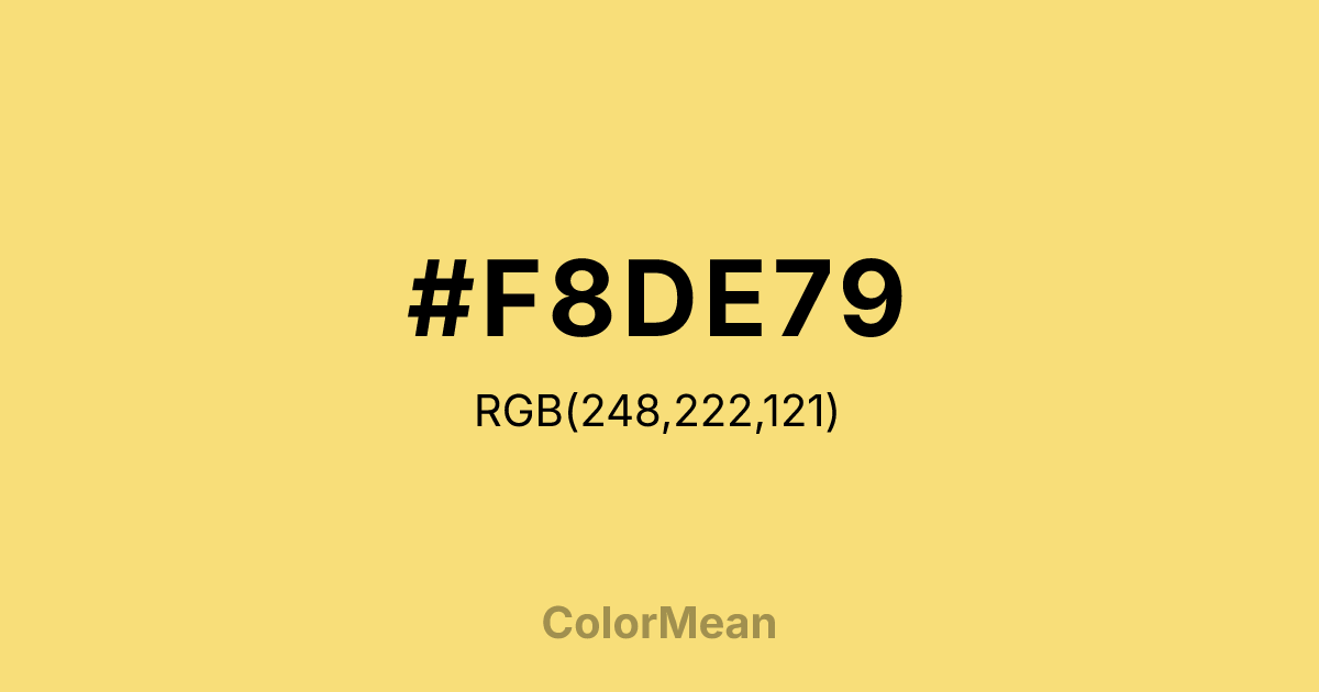 #F8DE79 RGB value is (248, 222, 121). The hex color red value is 248, green is 222, and blue is 121. Its HSL format shows a hue of 48°, saturation of 90 percent, and lightness of 72 percent. The CMYK process values are 0 percent, 10 percent, 51 percent, 3 percent.