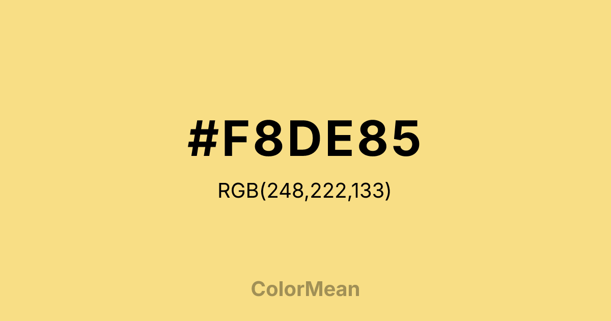 #F8DE85 RGB value is (248, 222, 133). The hex color red value is 248, green is 222, and blue is 133. Its HSL format shows a hue of 46°, saturation of 89 percent, and lightness of 75 percent. The CMYK process values are 0 percent, 10 percent, 46 percent, 3 percent.