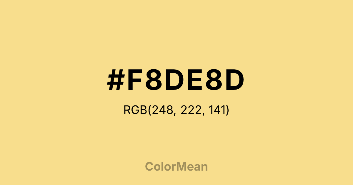 #F8DE8D RGB value is (248, 222, 141). The hex color red value is 248, green is 222, and blue is 141. Its HSL format shows a hue of 45°, saturation of 88 percent, and lightness of 76 percent. The CMYK process values are 0 percent, 10 percent, 43 percent, 3 percent.