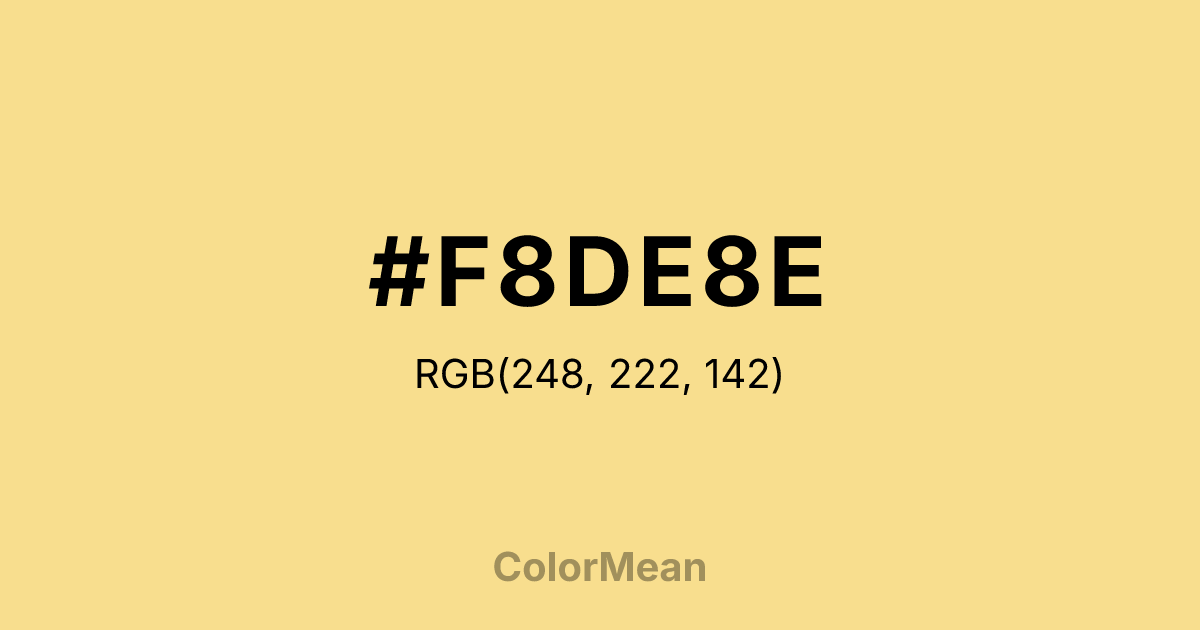 #F8DE8E RGB value is (248, 222, 142). The hex color red value is 248, green is 222, and blue is 142. Its HSL format shows a hue of 45°, saturation of 88 percent, and lightness of 76 percent. The CMYK process values are 0 percent, 10 percent, 43 percent, 3 percent.