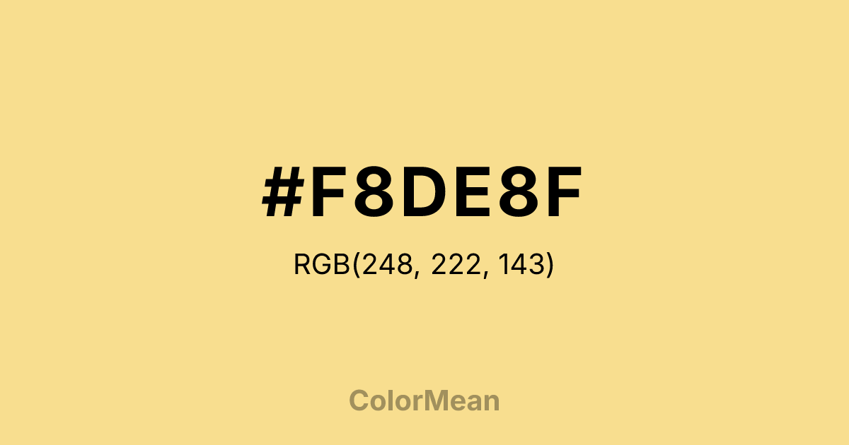 #F8DE8F RGB value is (248, 222, 143). The hex color red value is 248, green is 222, and blue is 143. Its HSL format shows a hue of 45°, saturation of 88 percent, and lightness of 77 percent. The CMYK process values are 0 percent, 10 percent, 42 percent, 3 percent.