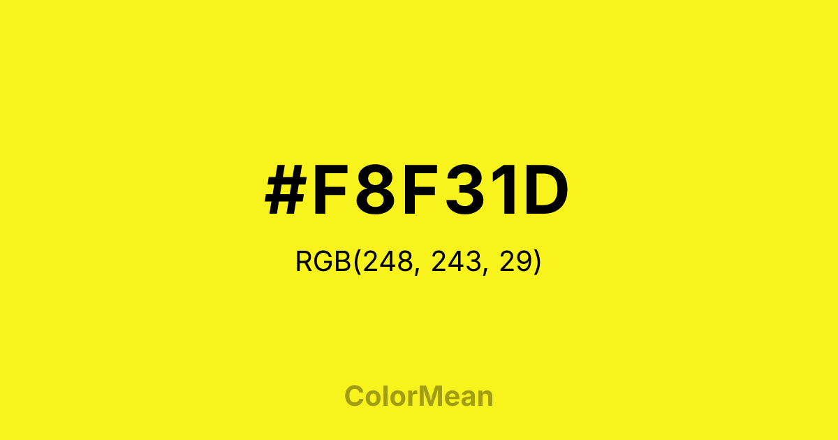 #F8F31D RGB value is (248, 243, 29). The hex color red value is 248, green is 243, and blue is 29. Its HSL format shows a hue of 59°, saturation of 94 percent, and lightness of 54 percent. The CMYK process values are 0 percent, 2 percent, 88 percent, 3 percent.