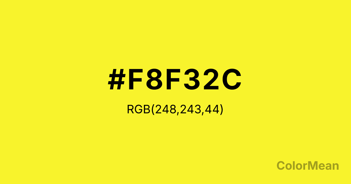 #F8F32C RGB value is (248, 243, 44). The hex color red value is 248, green is 243, and blue is 44. Its HSL format shows a hue of 59°, saturation of 94 percent, and lightness of 57 percent. The CMYK process values are 0 percent, 2 percent, 82 percent, 3 percent.