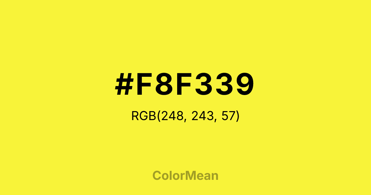#F8F339 RGB value is (248, 243, 57). The hex color red value is 248, green is 243, and blue is 57. Its HSL format shows a hue of 58°, saturation of 93 percent, and lightness of 60 percent. The CMYK process values are 0 percent, 2 percent, 77 percent, 3 percent.