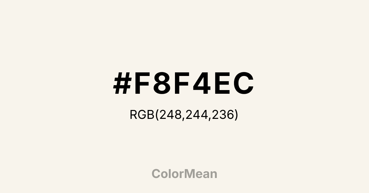 #F8F4EC RGB value is (248, 244, 236). The hex color red value is 248, green is 244, and blue is 236. Its HSL format shows a hue of 40°, saturation of 46 percent, and lightness of 95 percent. The CMYK process values are 0 percent, 2 percent, 5 percent, 3 percent.