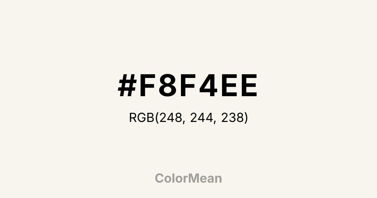 #F8F4EE RGB value is (248, 244, 238). The hex color red value is 248, green is 244, and blue is 238. Its HSL format shows a hue of 36°, saturation of 42 percent, and lightness of 95 percent. The CMYK process values are 0 percent, 2 percent, 4 percent, 3 percent.