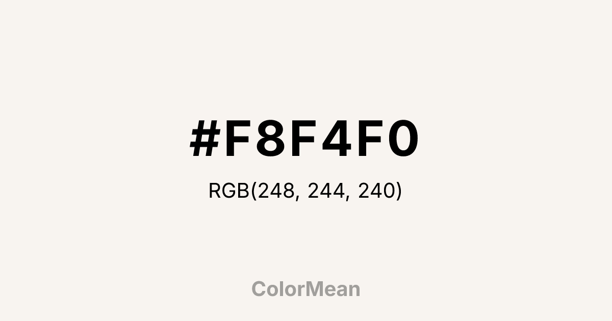#F8F4F0 RGB value is (248, 244, 240). The hex color red value is 248, green is 244, and blue is 240. Its HSL format shows a hue of 30°, saturation of 36 percent, and lightness of 96 percent. The CMYK process values are 0 percent, 2 percent, 3 percent, 3 percent.