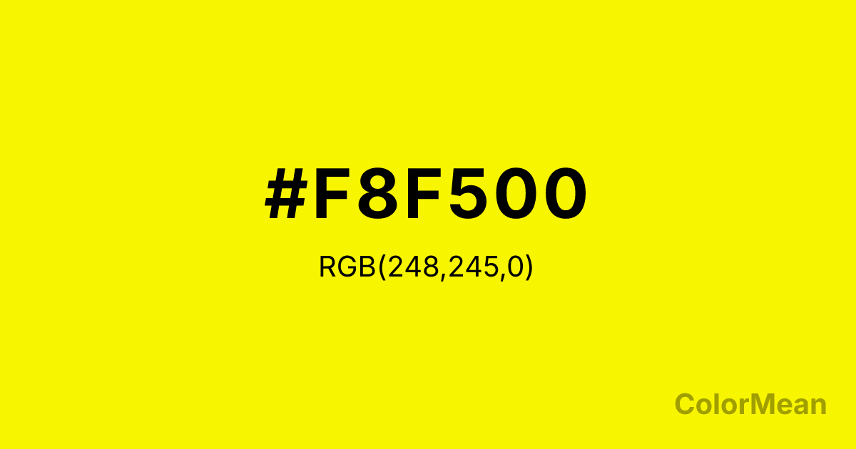#F8F500 RGB value is (248, 245, 0). The hex color red value is 248, green is 245, and blue is 0. Its HSL format shows a hue of 59°, saturation of 100 percent, and lightness of 49 percent. The CMYK process values are 0 percent, 1 percent, 100 percent, 3 percent.