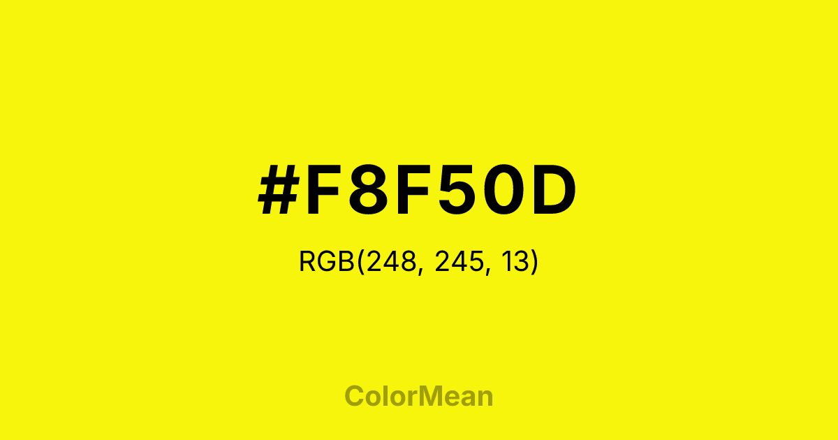 #F8F50D RGB value is (248, 245, 13). The hex color red value is 248, green is 245, and blue is 13. Its HSL format shows a hue of 59°, saturation of 94 percent, and lightness of 51 percent. The CMYK process values are 0 percent, 1 percent, 95 percent, 3 percent.