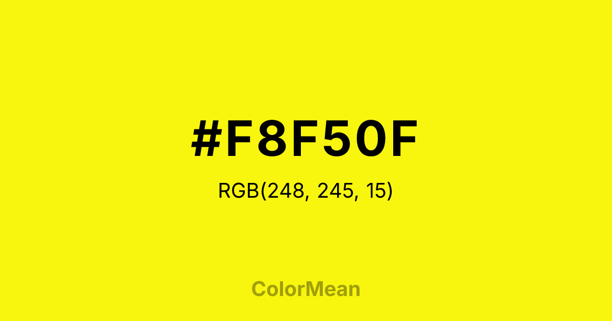 #F8F50F RGB value is (248, 245, 15). The hex color red value is 248, green is 245, and blue is 15. Its HSL format shows a hue of 59°, saturation of 94 percent, and lightness of 52 percent. The CMYK process values are 0 percent, 1 percent, 94 percent, 3 percent.