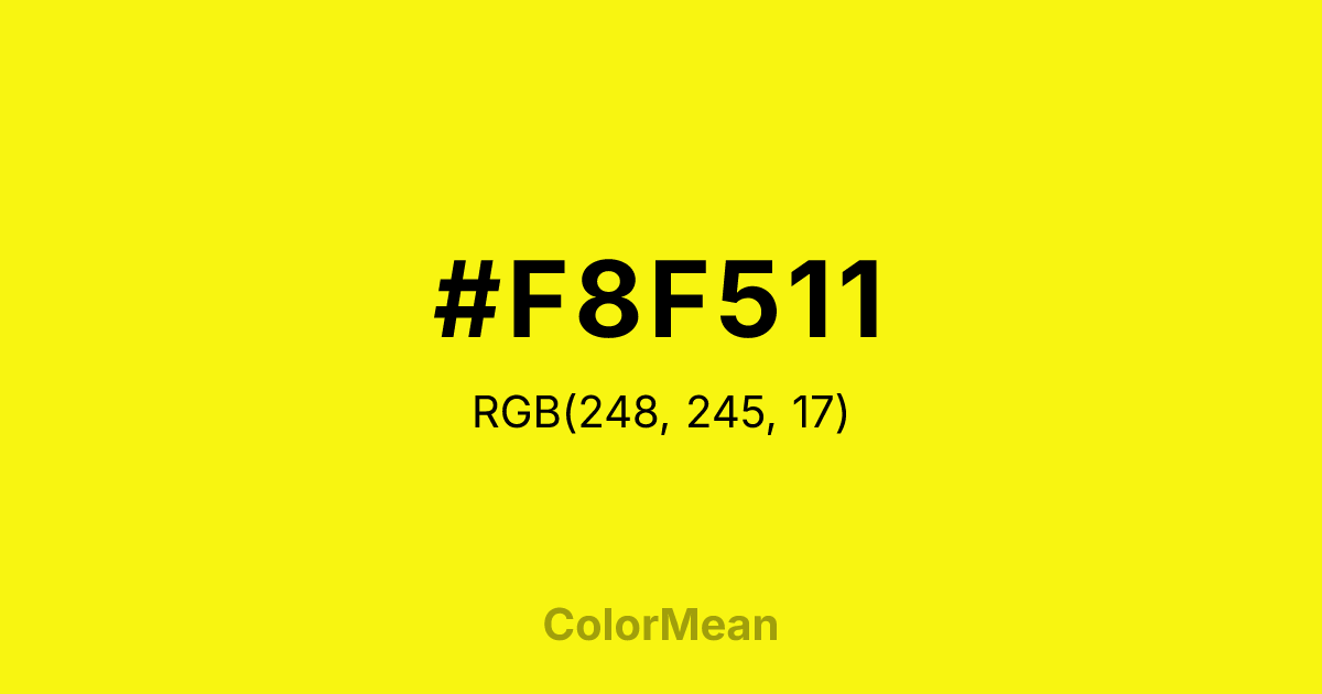 #F8F511 RGB value is (248, 245, 17). The hex color red value is 248, green is 245, and blue is 17. Its HSL format shows a hue of 59°, saturation of 94 percent, and lightness of 52 percent. The CMYK process values are 0 percent, 1 percent, 93 percent, 3 percent.