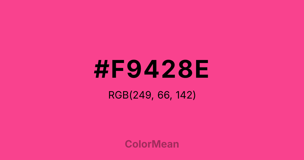 #F9428E RGB value is (249, 66, 142). The hex color red value is 249, green is 66, and blue is 142. Its HSL format shows a hue of 335°, saturation of 94 percent, and lightness of 62 percent. The CMYK process values are 0 percent, 73 percent, 43 percent, 2 percent.