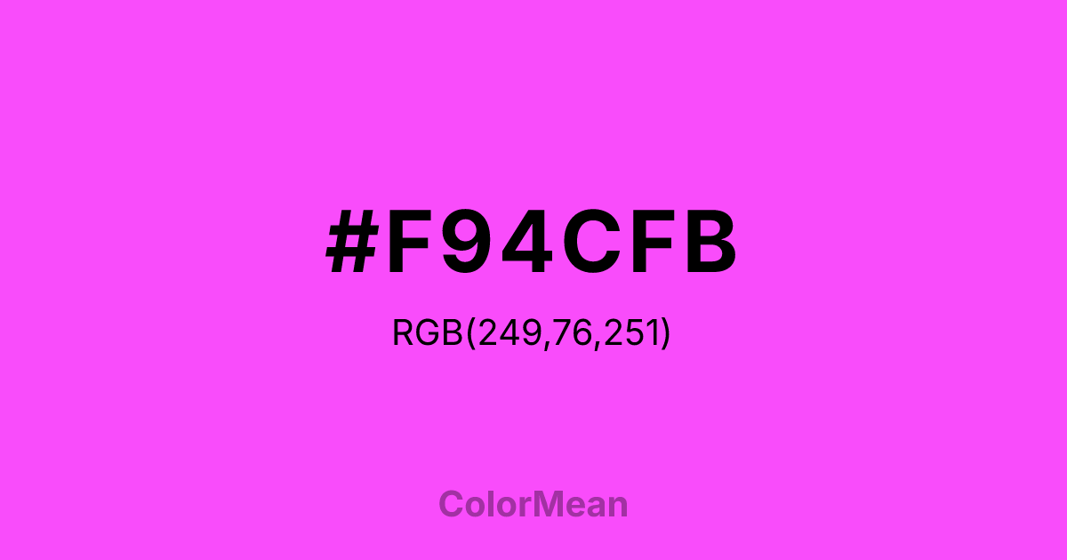#F94CFB RGB value is (249, 76, 251). The hex color red value is 249, green is 76, and blue is 251. Its HSL format shows a hue of 299°, saturation of 96 percent, and lightness of 64 percent. The CMYK process values are 1 percent, 70 percent, 0 percent, 2 percent.