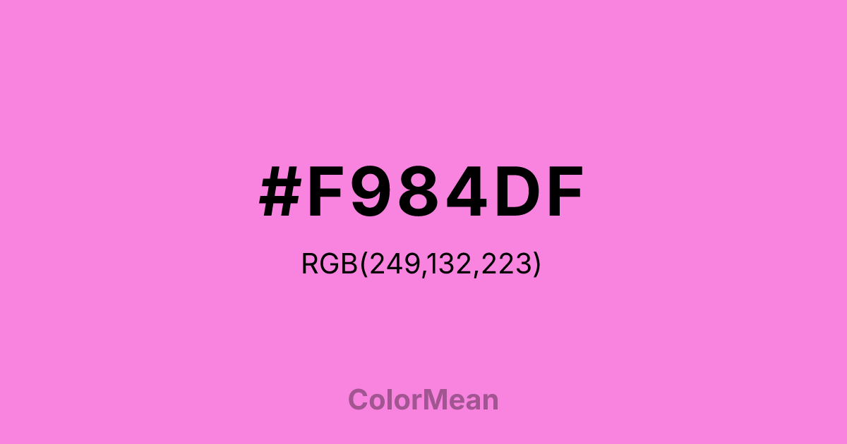 #F984DF RGB value is (249, 132, 223). The hex color red value is 249, green is 132, and blue is 223. Its HSL format shows a hue of 313°, saturation of 91 percent, and lightness of 75 percent. The CMYK process values are 0 percent, 47 percent, 10 percent, 2 percent.
