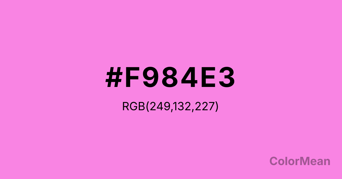 #F984E3 RGB value is (249, 132, 227). The hex color red value is 249, green is 132, and blue is 227. Its HSL format shows a hue of 311°, saturation of 91 percent, and lightness of 75 percent. The CMYK process values are 0 percent, 47 percent, 9 percent, 2 percent.