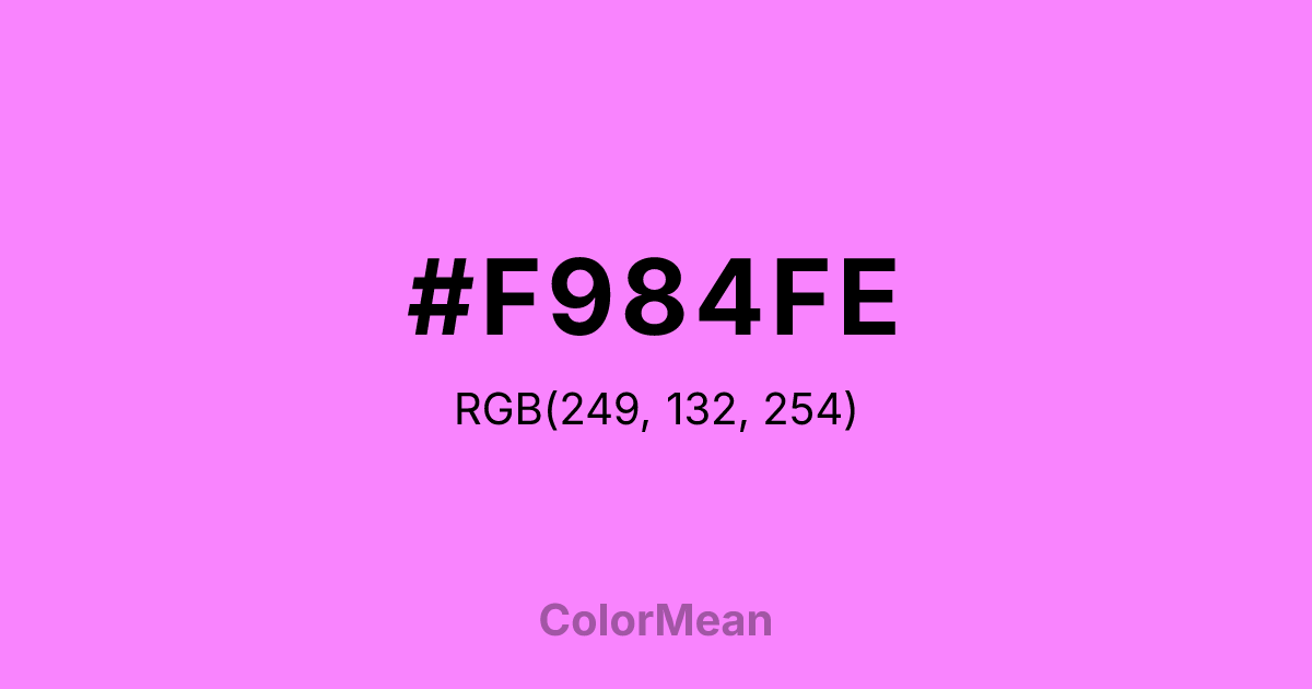 #F984FE RGB value is (249, 132, 254). The hex color red value is 249, green is 132, and blue is 254. Its HSL format shows a hue of 298°, saturation of 98 percent, and lightness of 76 percent. The CMYK process values are 2 percent, 48 percent, 0 percent, 0 percent.