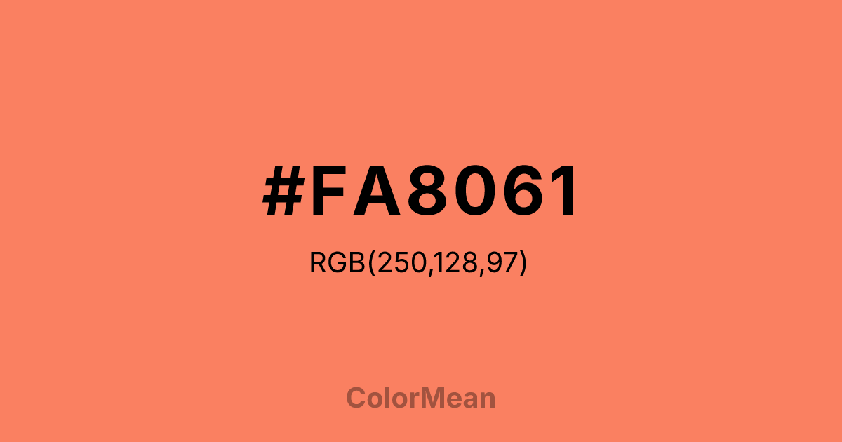 #FA8061 RGB value is (250, 128, 97). The hex color red value is 250, green is 128, and blue is 97. Its HSL format shows a hue of 12°, saturation of 94 percent, and lightness of 68 percent. The CMYK process values are 0 percent, 49 percent, 61 percent, 2 percent.