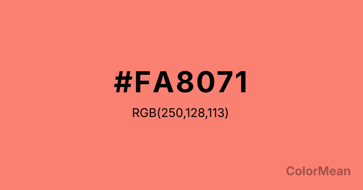 #FA8071 RGB value is (250, 128, 113). The hex color red value is 250, green is 128, and blue is 113. Its HSL format shows a hue of 7°, saturation of 93 percent, and lightness of 71 percent. The CMYK process values are 0 percent, 49 percent, 55 percent, 2 percent.