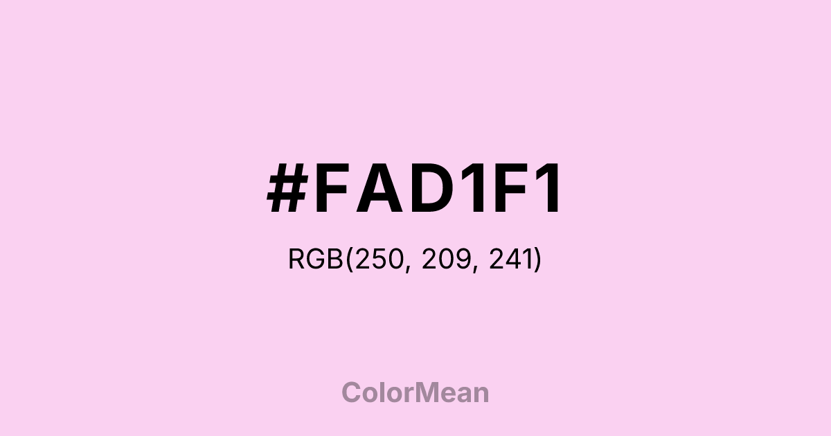 #FAD1F1 RGB value is (250, 209, 241). The hex color red value is 250, green is 209, and blue is 241. Its HSL format shows a hue of 313°, saturation of 80 percent, and lightness of 90 percent. The CMYK process values are 0 percent, 16 percent, 4 percent, 2 percent.