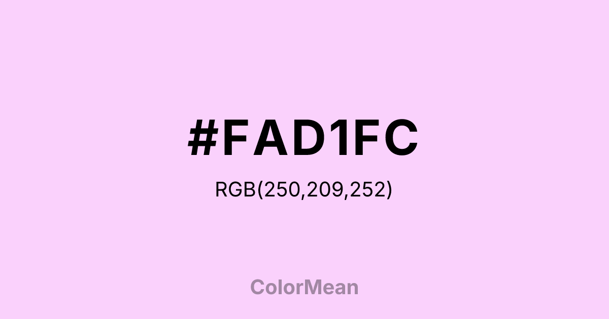 #FAD1FC RGB value is (250, 209, 252). The hex color red value is 250, green is 209, and blue is 252. Its HSL format shows a hue of 297°, saturation of 88 percent, and lightness of 90 percent. The CMYK process values are 1 percent, 17 percent, 0 percent, 1 percent.