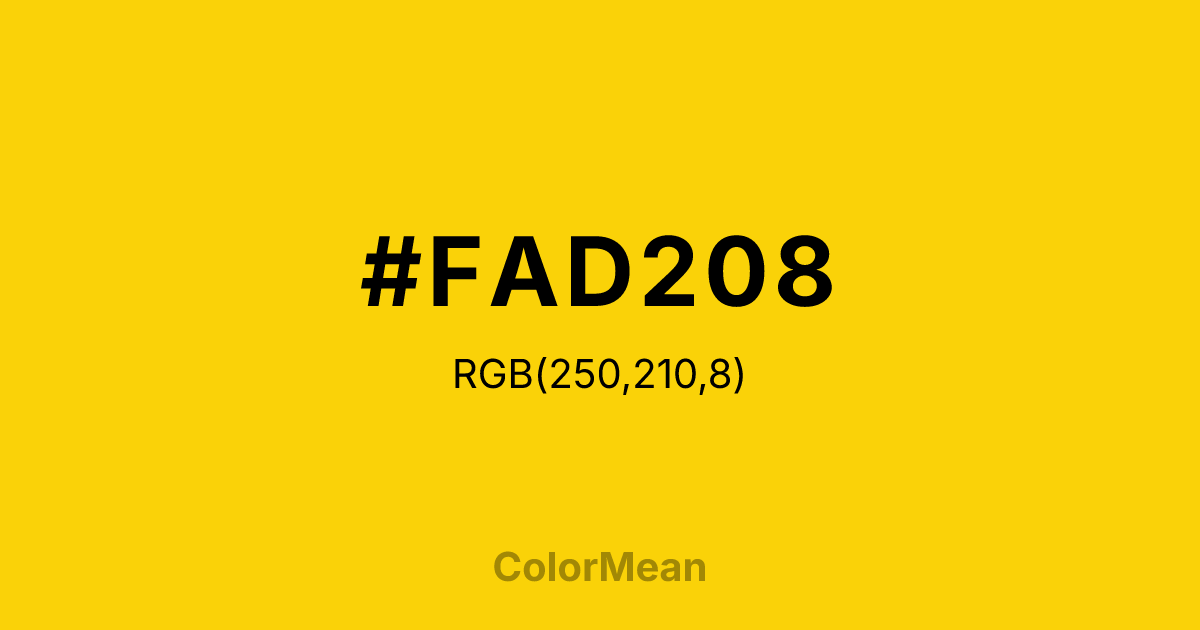 #FAD208 RGB value is (250, 210, 8). The hex color red value is 250, green is 210, and blue is 8. Its HSL format shows a hue of 50°, saturation of 96 percent, and lightness of 51 percent. The CMYK process values are 0 percent, 16 percent, 97 percent, 2 percent.