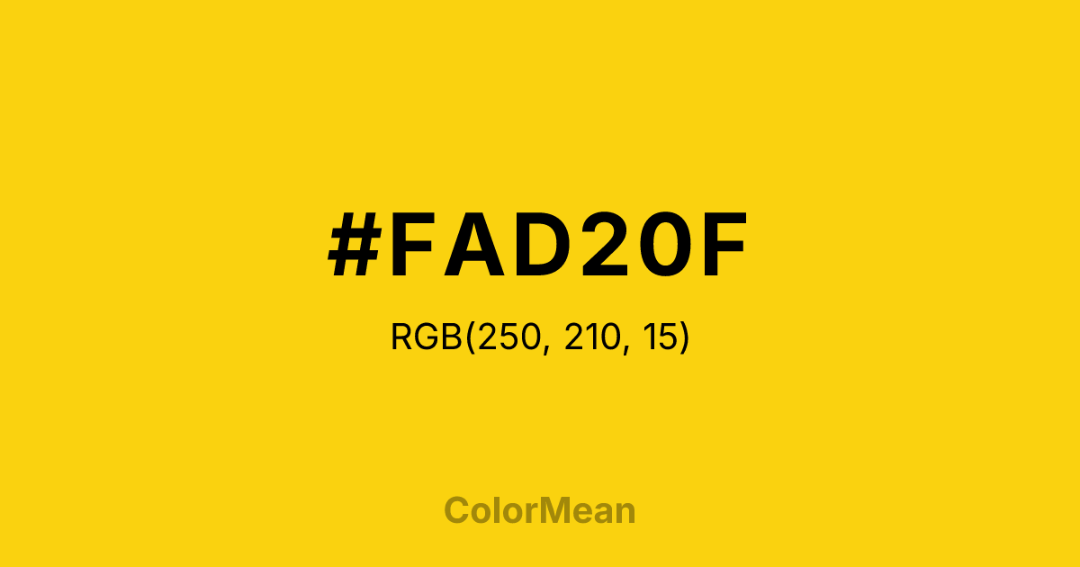 #FAD20F RGB value is (250, 210, 15). The hex color red value is 250, green is 210, and blue is 15. Its HSL format shows a hue of 50°, saturation of 96 percent, and lightness of 52 percent. The CMYK process values are 0 percent, 16 percent, 94 percent, 2 percent.
