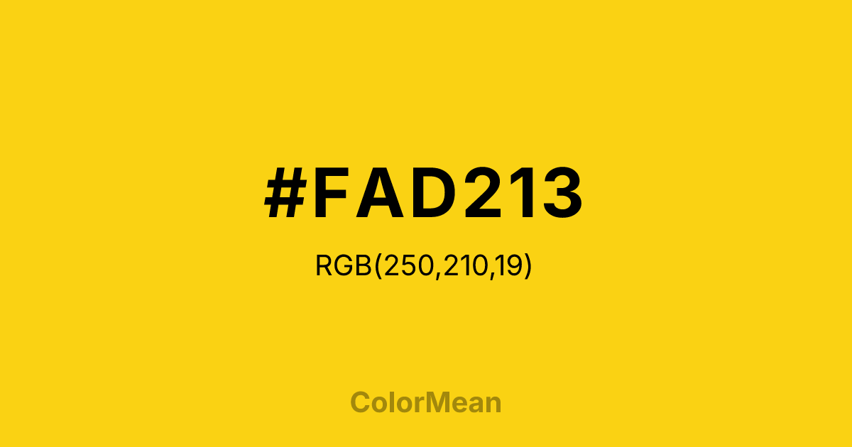 #FAD213 RGB value is (250, 210, 19). The hex color red value is 250, green is 210, and blue is 19. Its HSL format shows a hue of 50°, saturation of 96 percent, and lightness of 53 percent. The CMYK process values are 0 percent, 16 percent, 92 percent, 2 percent.