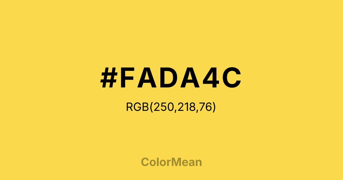 #FADA4C RGB value is (250, 218, 76). The hex color red value is 250, green is 218, and blue is 76. Its HSL format shows a hue of 49°, saturation of 95 percent, and lightness of 64 percent. The CMYK process values are 0 percent, 13 percent, 70 percent, 2 percent.