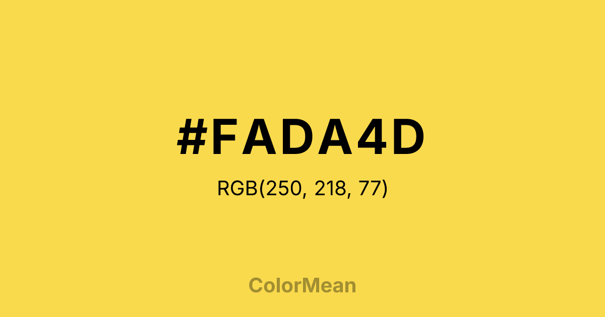 #FADA4D RGB value is (250, 218, 77). The hex color red value is 250, green is 218, and blue is 77. Its HSL format shows a hue of 49°, saturation of 95 percent, and lightness of 64 percent. The CMYK process values are 0 percent, 13 percent, 69 percent, 2 percent.