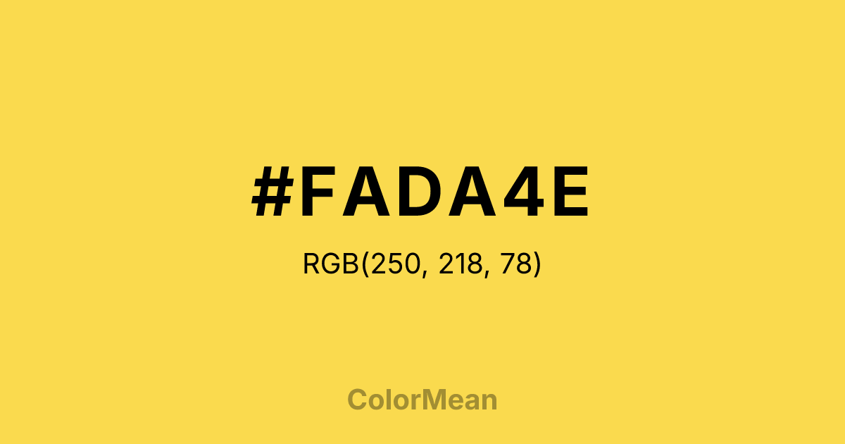 #FADA4E RGB value is (250, 218, 78). The hex color red value is 250, green is 218, and blue is 78. Its HSL format shows a hue of 49°, saturation of 95 percent, and lightness of 64 percent. The CMYK process values are 0 percent, 13 percent, 69 percent, 2 percent.