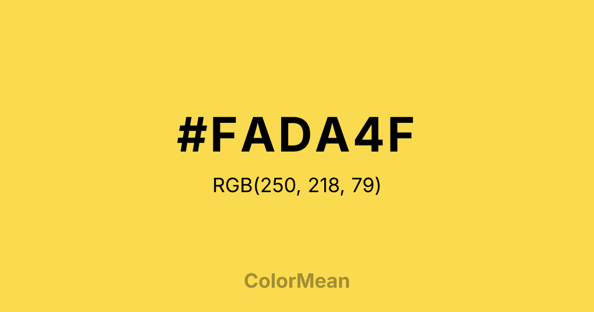 #FADA4F RGB value is (250, 218, 79). The hex color red value is 250, green is 218, and blue is 79. Its HSL format shows a hue of 49°, saturation of 94 percent, and lightness of 65 percent. The CMYK process values are 0 percent, 13 percent, 68 percent, 2 percent.