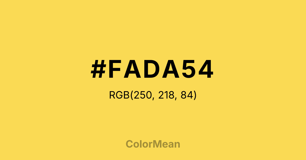 #FADA54 RGB value is (250, 218, 84). The hex color red value is 250, green is 218, and blue is 84. Its HSL format shows a hue of 48°, saturation of 94 percent, and lightness of 65 percent. The CMYK process values are 0 percent, 13 percent, 66 percent, 2 percent.