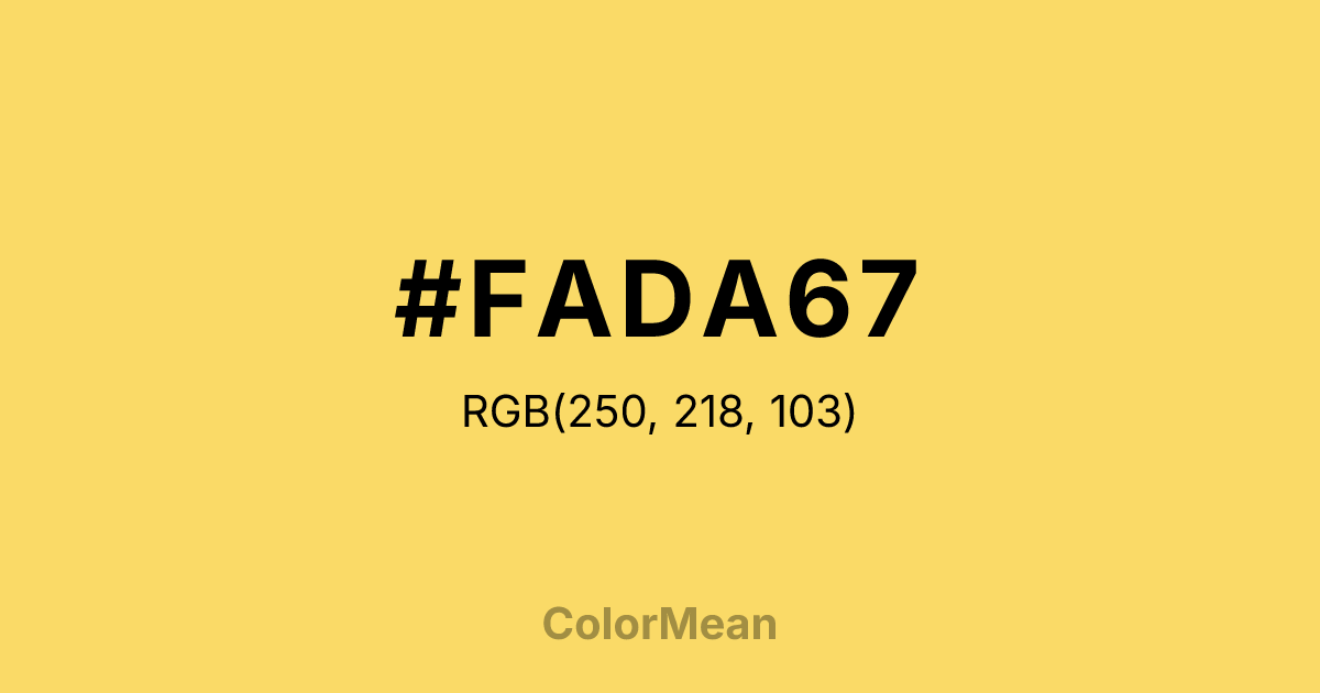 #FADA67 RGB value is (250, 218, 103). The hex color red value is 250, green is 218, and blue is 103. Its HSL format shows a hue of 47°, saturation of 94 percent, and lightness of 69 percent. The CMYK process values are 0 percent, 13 percent, 59 percent, 2 percent.