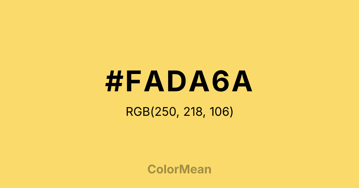 #FADA6A RGB value is (250, 218, 106). The hex color red value is 250, green is 218, and blue is 106. Its HSL format shows a hue of 47°, saturation of 94 percent, and lightness of 70 percent. The CMYK process values are 0 percent, 13 percent, 58 percent, 2 percent.